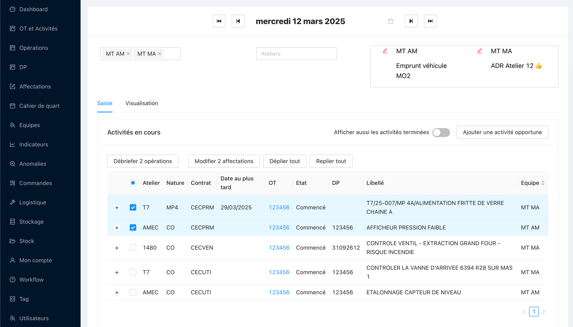 Sur une interface claire, les responsables d'équipe visualisent les tâches du jour, les notes importantes, et peuvent organiser le debriefing en fin de poste. Les intervenants renseignent le temps passé, les difficultés rencontrées, et l'avancement réel des travaux.